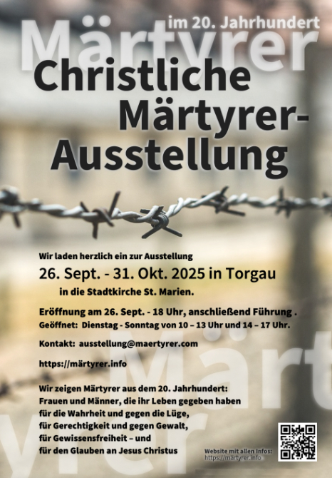 Bis zum 31. Oktober 2025 wird in der Stadtkirche St. Marien eine kleine Ausstellung zu Christlichen Märtyrern des 20. Jahrhunderts gezeigt. Sie kann zu den Öffnungszeiten der Stadtkirche täglich 10 – 17 Uhr, außer montags, besichtigt werden.